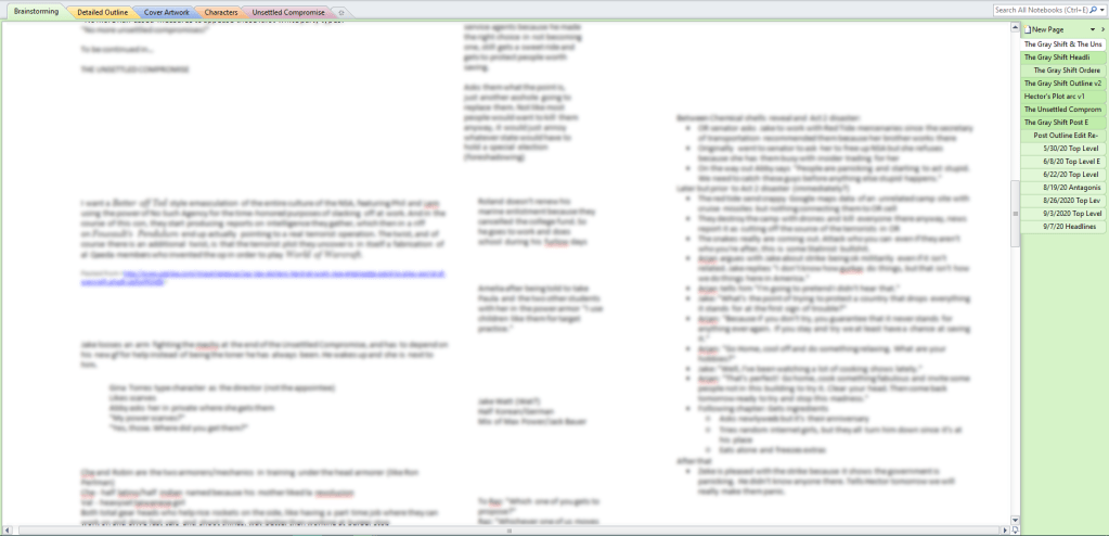 My main outlining tool of choice is OneNote. I like it for a couple reasons:
