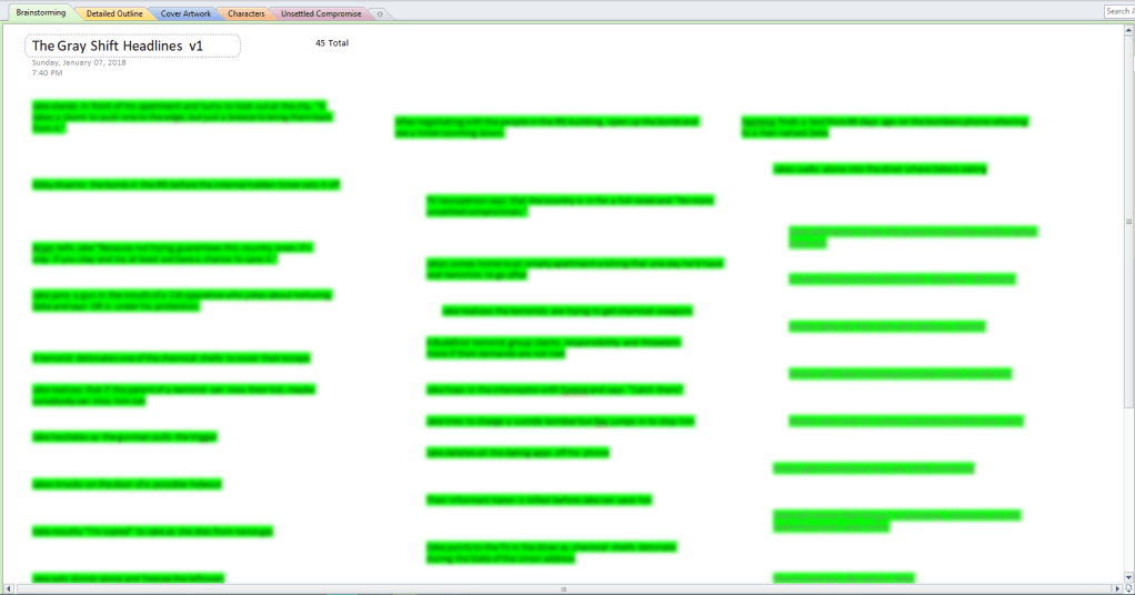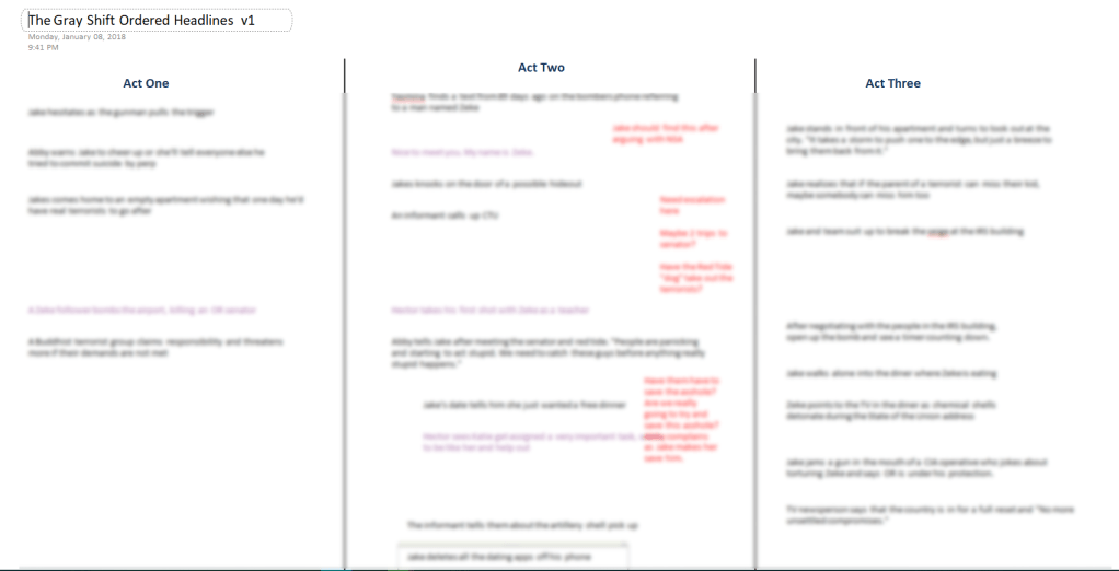 One of the big changes between my first book Full Coverage and my next book The Gray Shift is that I am getting the outline edited by my awesome editor before I even start writing drafts of the book. Writing drafts of an outline is a lot faster than writing drafts of an entire book so I’m trying to get all the plot points and chapters figured out up front so that I don’t waste time writing chapters that wind up getting cut. That will probably still happen, but hopefully not as much.