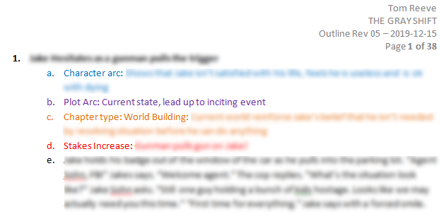 Technically, all the previous steps were “writing the outline” too, but now you write out the summary of each chapter in a Word doc so you can send it out for editing. Each chapter starts off with the following information, which I color code as shown below: