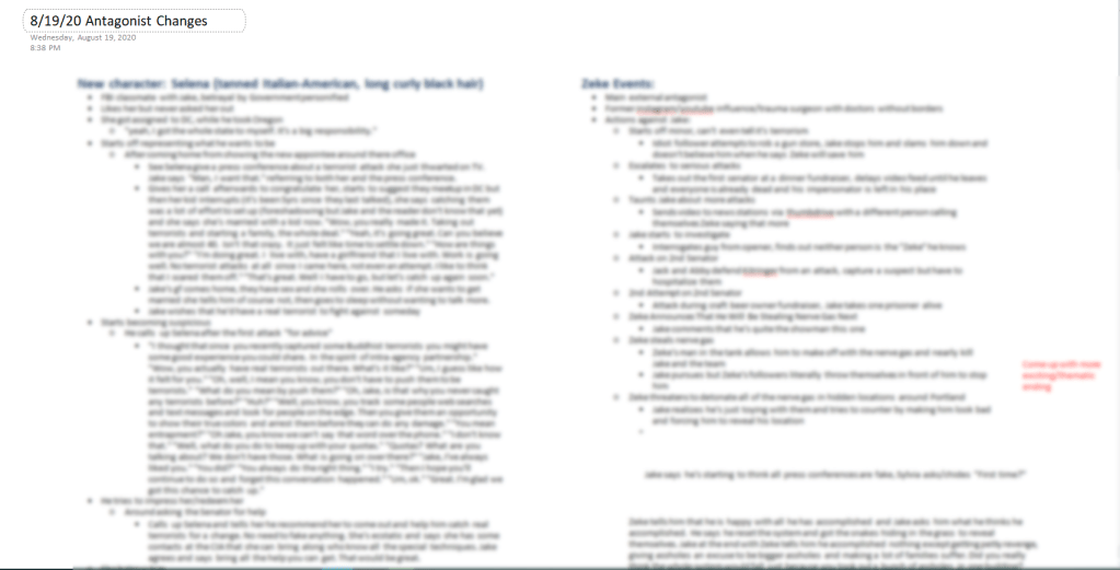 This led me to make a new page where I made a mini outline for every antagonist in the book. The Gray Shift has four antagonists throughout the story, with one main one and three secondary ones. Writing out their interactions with the main character individually really cleared things up for me and made it easier to spot gaps in each of their arcs.