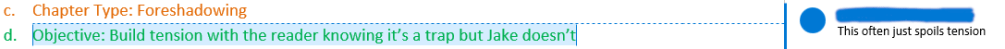 The two chapters that need to be deleted are both from the villain POV and they are being deleted since they ruin the tension of the main character POV scenes. They resulted in amusing feedback like this: