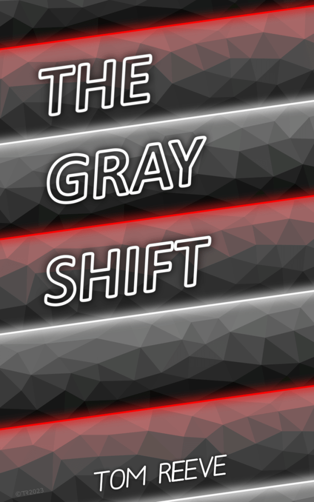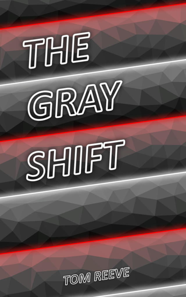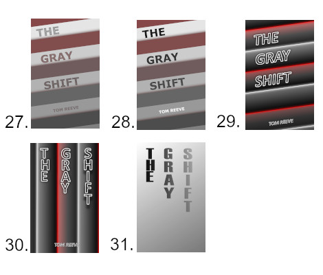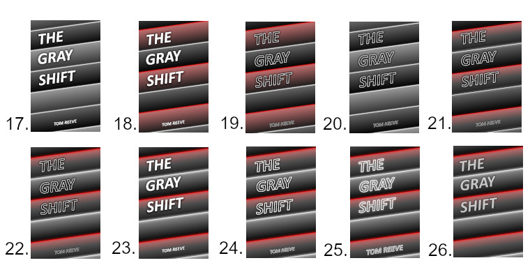 Since the curved stripes were taking up a lot of space, I then tried going for straight angled stripes instead. This let me make the title text bigger relative to the stripes and also gives the cover a cool action movie feel, which fits well with a satirical thriller book. At this point I skewed the font to follow the path of the stripes, so it stops being standard Calibri at this point. Next I tried out going full grayscale to fit The Gray Shift book title theme more, but the text gets lots in the stripes when everything is a shade of gray. I also tried out solid white, outlined white and gradient white to transparent text. The outlined white and the solid white text worked the best, but more iteration was needed and not just because Inkscape made all of these versions 30% transparent for some reason.