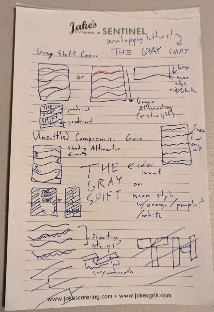 First off I started by doodling a few concept ideas by hand. The concept I was going for was the wavy red and white stripes of the American flag gradually being desaturated to gray as you went down the image. The title text would then go on top of that with a different word for each row.
