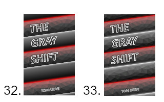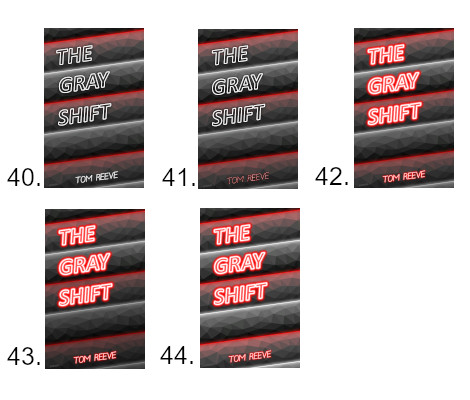 The second suggestion was to try out adding red to the title text to make it stand out more against the gray background. Since I knew from #’s 37-39 that just filling it in with red would be hard to read. I instead used Nick Saporito’s Neon Text Effect tutorial, but I skipped the background gradient part since I already had a background. After playing with it a bit, I found that having red outer “glow” layers with a white “hot” layer in the center contrasted well with the background but was still very easy to read. I applied this effect to both the outlined title text and the single line author name and it came out very well!